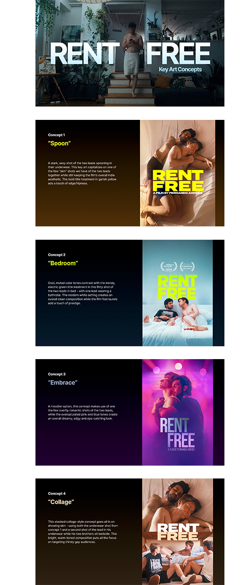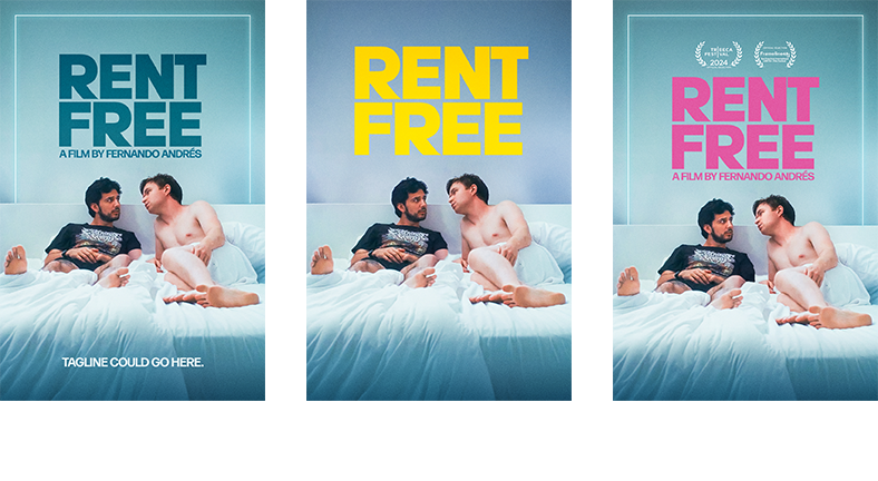 The client will typically pick a winning design (or will request a mix-and-match design pulling elements from several poster concepts) and will request revisions for the final design. In the case of Rent Free, the client chose concept 2, but wanted to see the title treatment in alternate colors. They also wanted to add a little additional copy (the director‘s credit) and film festival laurels in order to fill some of the negative space.